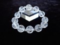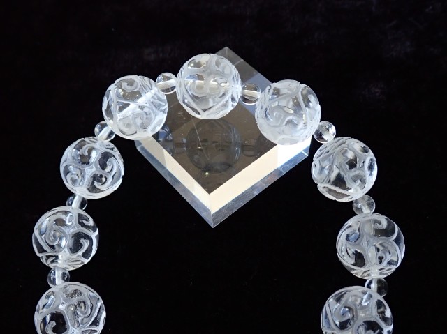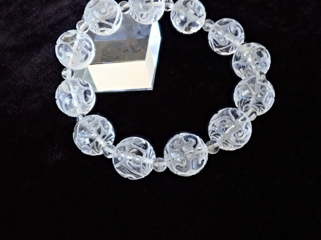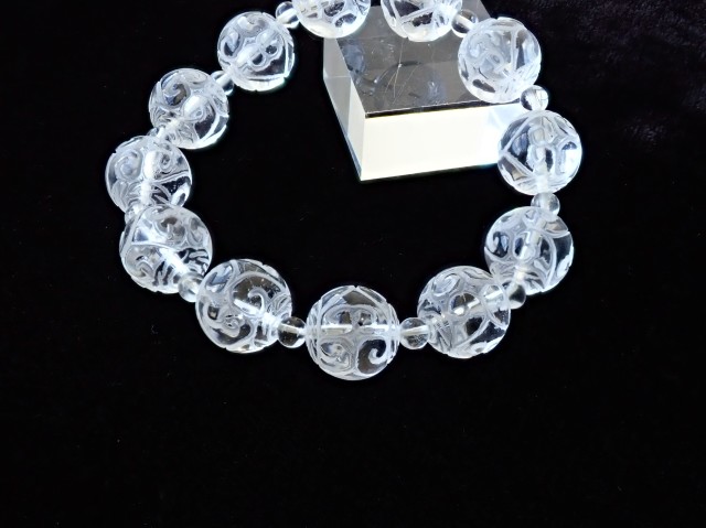 【商品詳細】 産地ブラジル 水晶 回紋珠 ブレスレット サイズ:13.5mm~14mm×12粒 約4.5mm×12粒 腕回り:約16.5cm ※サイズ・重量については多少前後する場合があります。 ※天然石の為、原石特有の凹凸、小傷等がある場合がございます。 チベット仏教の仏具マニ車にも描かれている回紋の模様がラウンドビーズに彫刻されています。回紋は、繋がって終わらないという意味があり、富や幸福が繋がり終わらないと云われています。