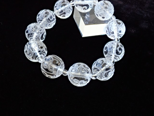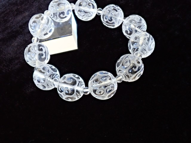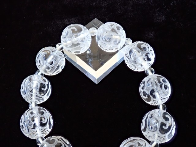 チベット仏教の仏具マニ車にも描かれている回紋の模様がラウンドビーズに彫刻されています。回紋は、繋がって終わらないという意味があり、富や幸福が繋がり終わらないと云われています。