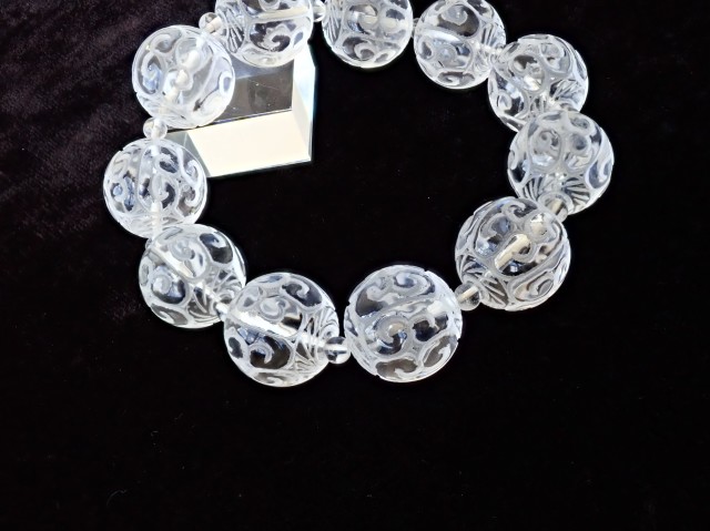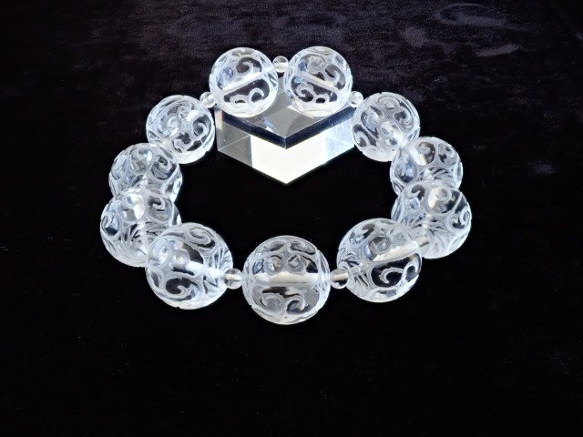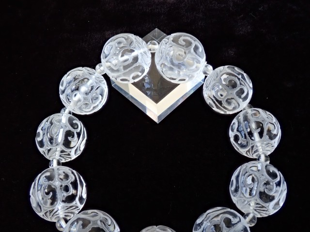 【商品詳細】 産地ブラジル 水晶 回紋珠 ブレスレット サイズ:19mm×11粒 約4.5mm×11粒 腕回り:約19cm ※サイズ・重量については多少前後する場合があります。 ※天然石の為、原石特有の凹凸、小傷等がある場合がございます。 チベット仏教の仏具マニ車にも描かれている回紋の模様がラウンドビーズに彫刻されています。回紋は、繋がって終わらないという意味があり、富や幸福が繋がり終わらないと云われています。