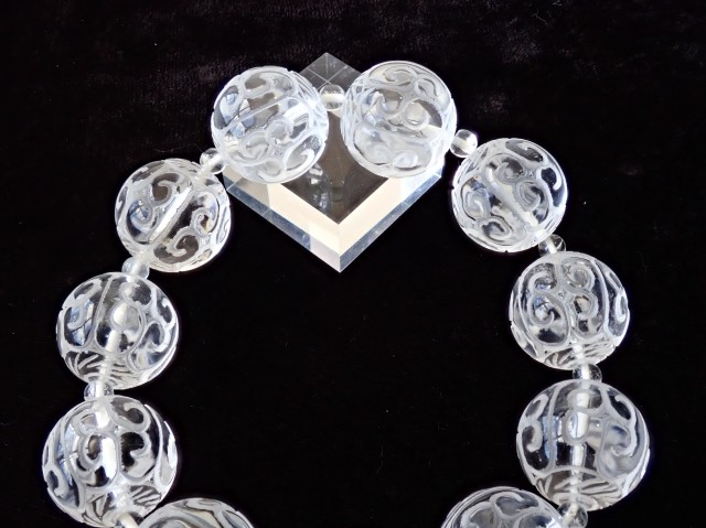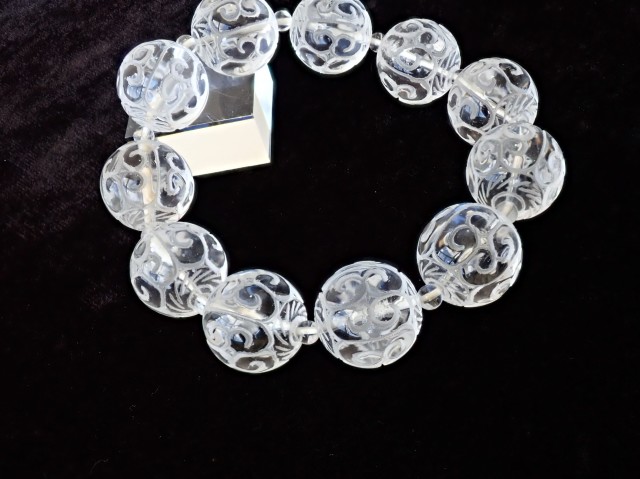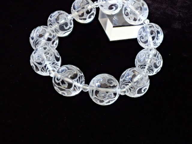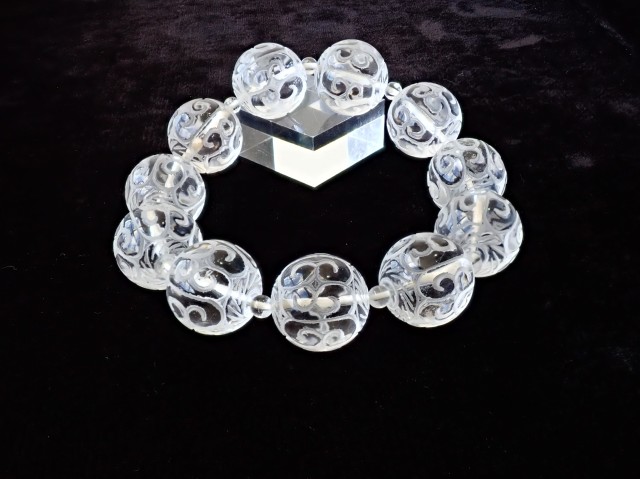 【商品詳細】 産地ブラジル 水晶 回紋珠 ブレスレット サイズ:19mm×11粒 約4.5mm×11粒 腕回り:約19cm ※サイズ・重量については多少前後する場合があります。 ※天然石の為、原石特有の凹凸、小傷等がある場合がございます。 チベット仏教の仏具マニ車にも描かれている回紋の模様がラウンドビーズに彫刻されています。回紋は、繋がって終わらないという意味があり、富や幸福が繋がり終わらないと云われています。