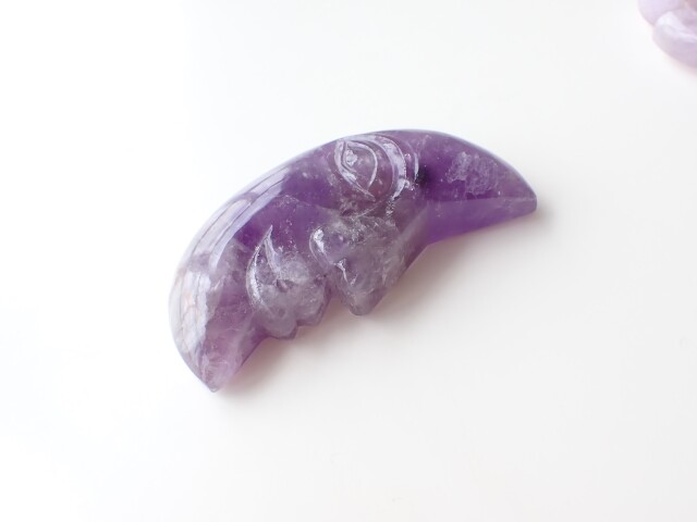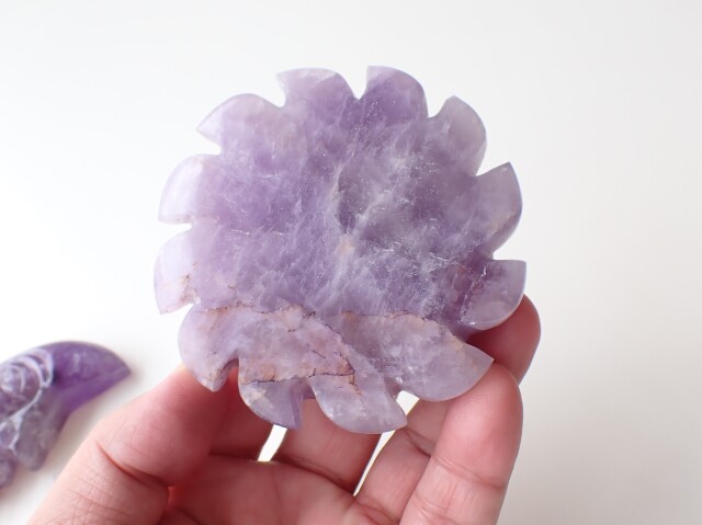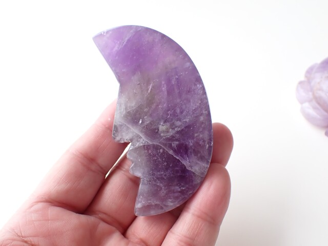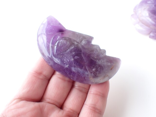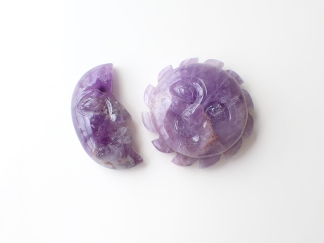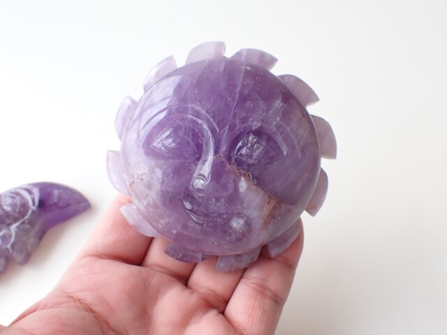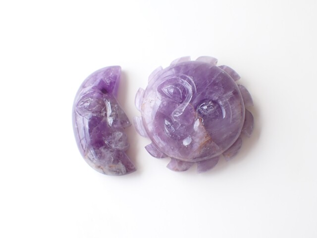 【商品詳細】 産地:インド アメジスト/太陽と月 太陽 サイズ:約85mm×32mm 重量:297.6g 月 サイズ:約83mm×44mm×19mm 重量:104.1g ※サイズは多少前後する場合があります。 ※天然石の為、原石特有の凹凸、小傷、インクルージョン等ある場合がございます。 こちらは原石段階で入っていたと思われるヒビや石目などが見受けられます。