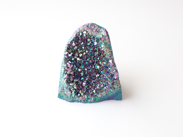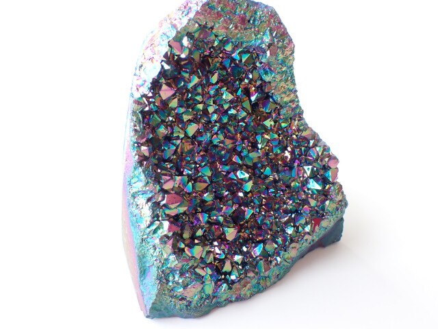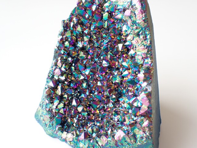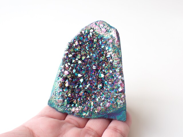 人工的に色を蒸着させたクリスタルですが七色に輝く色は大変綺麗で角度によって様々な色合いに変わっていきます。オーラ系の原石などは、欧米のヒーラーさんにも人気があり、アーカンソー産水晶のオーラ系原石なども有名です。ブラックアクアオーラは魔除けとしてもおすすめです。