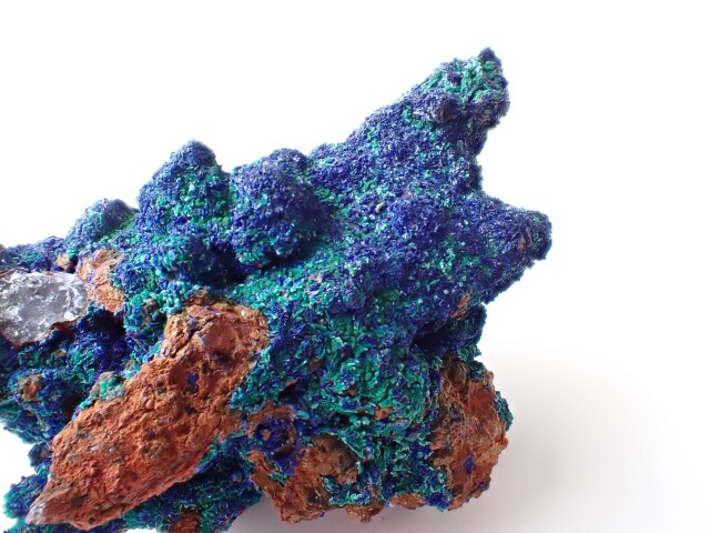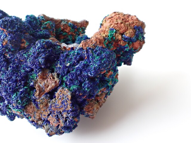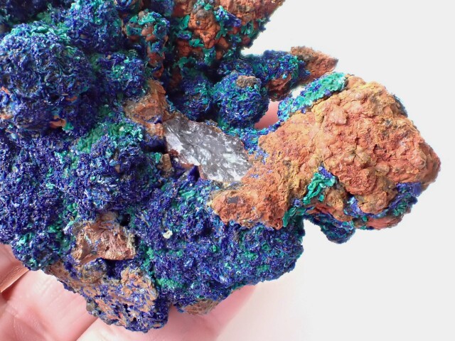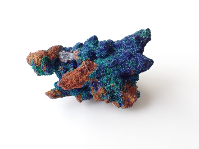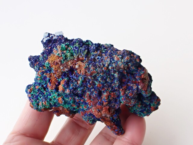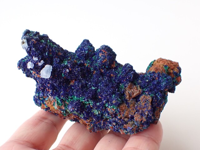 【商品詳細】 産地:モロッコ エルラシディア州産 アズライト/マラカイト/水晶 共生 サイズ:約96mm×60mm×59mm 重量:197.8g ※サイズ・重量については、多少前後する場合があります。 ※天然石の為、原石特有の凹凸、小傷等ある場合がございます。 水晶の上にアズライトやマラカイトが共生している珍しい原石です。