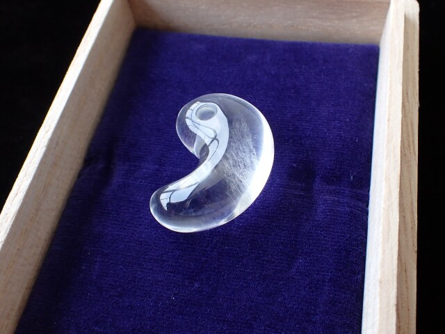 この度、特別なご縁を得て、『乙女鉱山産水晶』を入手。貴重な大型結晶の価値をより高めるため、出雲で140年余りの歴史を持つ老舗『めのうの店川島』様に託し、日本伝統の守護石『出雲型勾玉』に仕上げました。