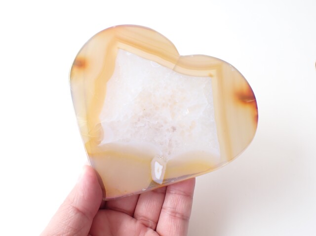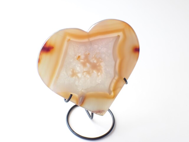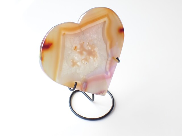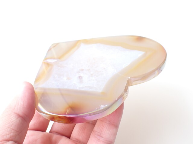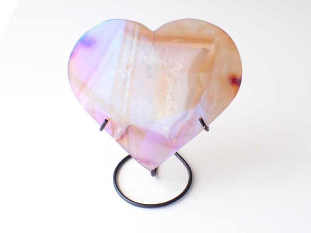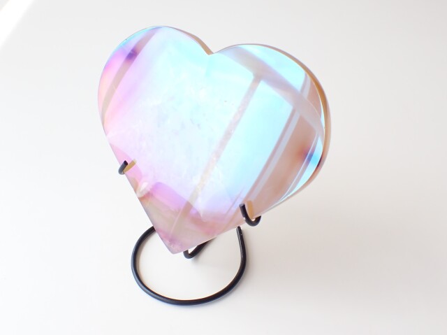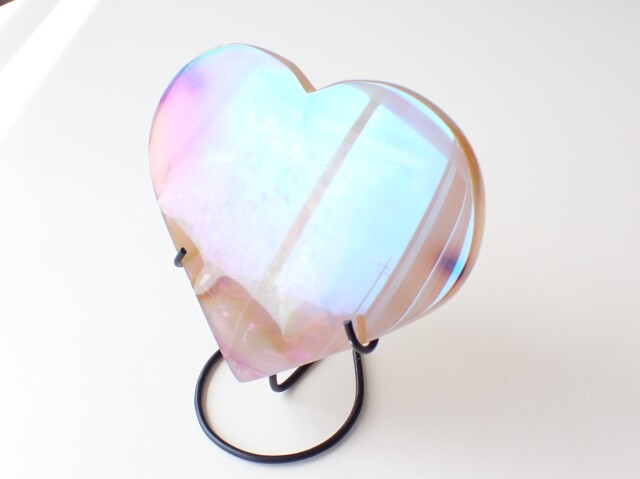 【商品詳細】 産地:ブラジル エンジェルオーラ アゲート ハート 台座付き サイズ(石):約130.6mm×120.2mm×9mm 重量:262g ※サイズ・重量については多少前後する場合があります。 ※天然石の為、原石特有の凹凸、小傷、インクルージョン等ある場合がございます。 チタンなどの金属を蒸着させた綺麗なアゲート(めのう)です。