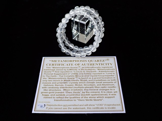 こちらは、A.メロディ女史の正規証明書付が付属するメタモルフォーシスクォーツです。約9年前、メロディ女史と親交のある方がビーズを作りたいということでメロディ女史より直接原石を譲っていただきビーズに加工したものです。その際にブレスレットに正規証明書を付属するということで発行していただいたものになります。メロディ女史より譲り受けた原石でビーズにしたものは恐らく他にはないものと思われます。その原石からは6mm、8mm、10mmの3サイズしか作っておりません。中にはスターの出る珠などもある場合がございます。品質とサイズも分けて出品致しました。A、AA、AAA、SA、SAupというグレードで全てのサイズが揃っているわけではございませんがどのグレードでもメタモルフォーシスクォーツの温かみが伝わる素晴らしいクリスタルかと思います。