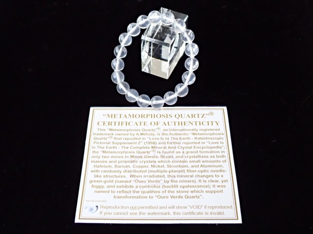 『メタモルフォーゼスクォーツ』は、同産地なのですがA.メロディ女史を経由せずに流通したものになりますので証明書等は付属致しません。