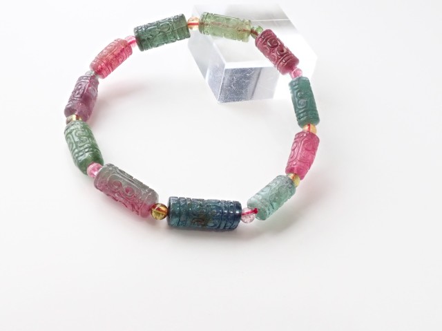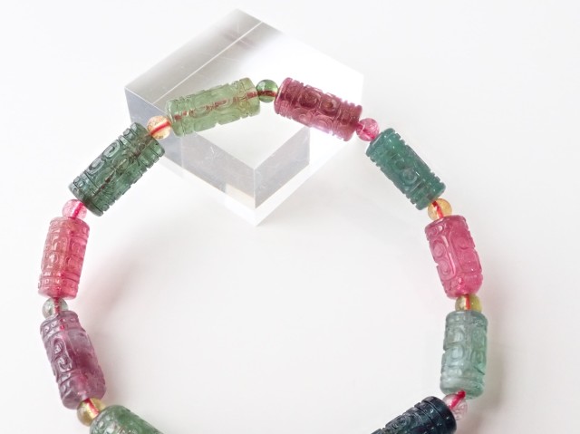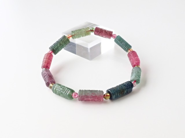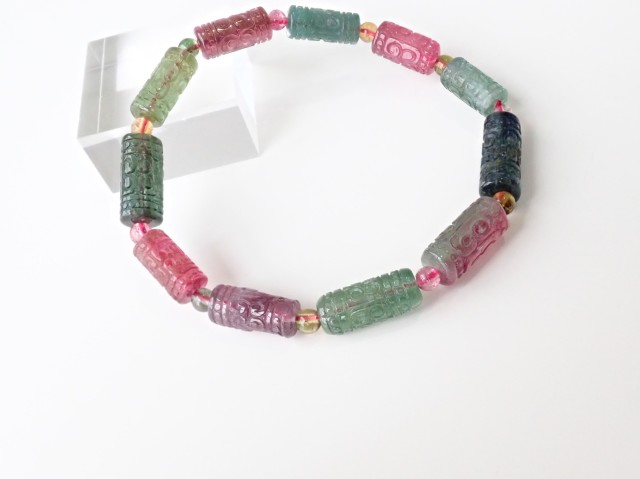 【商品詳細】 産地:ブラジル ミックストルマリン マニ車 ブレスレット サイズ:マニ車 約13mm×7mm~18mm×7mm程度 11粒 ラウンドビーズ 約4mm程度 11粒 腕回り:約18cm ※サイズ・重量については多少前後する場合があります。 ※天然石の為、原石特有の凹凸、小傷などある場合がございます。