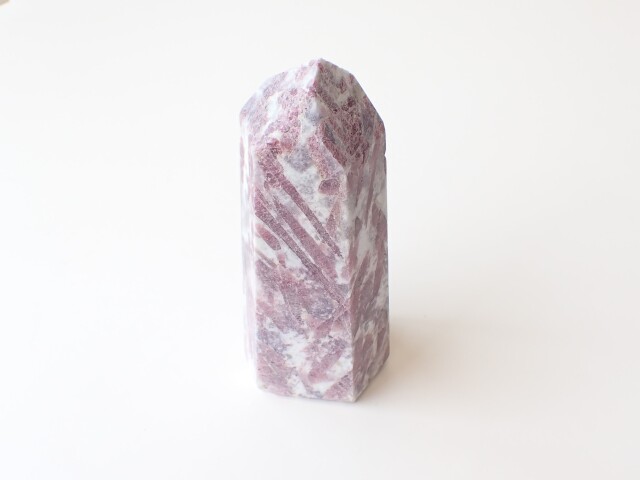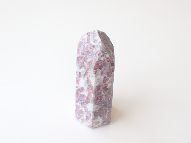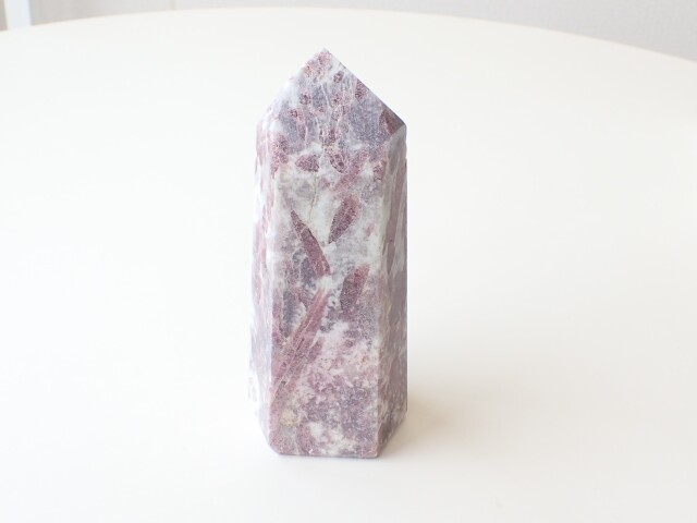 【商品詳細】 産地:ブラジル ピンクトルマリン ポイント(ポリッシュ) サイズ:約132mm×57mm×47mm 重量:554g ※サイズ・重量については多少前後する場合があります。 ※天然石の為、原石由来の凹凸や小傷、インクルージョン等ある場合がございます。 白い部分はアルバイト(曹長石)で、紫部分はレピドライトになります。