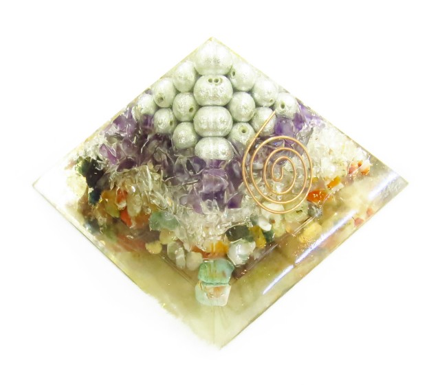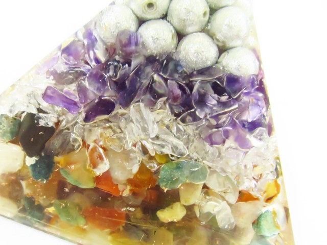 上部に入っているものはアルミメッキを施したビーズになると思われます。珍しい組み合わせのオルゴナイトです。