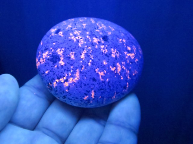 2017年の夏頃、アメリカ ミシガン州のスペリオル湖湖畔でエリック・リンタマキ氏によって発見された新種の天然石になります。小石のように見えるこの石は、紫外線で蛍光するという特徴がございます。このオレンジに蛍光する石は、ミシガン州立大学で調査の結果、新種の石であることが判明し、『蛍光性方ソーダ石含有閃長岩』という名称となりました。また、ミシガン州アッパー半島に暮らす人を指す『ユーパーズ』にちなんで『ユーパーライト』という通称名になりました。