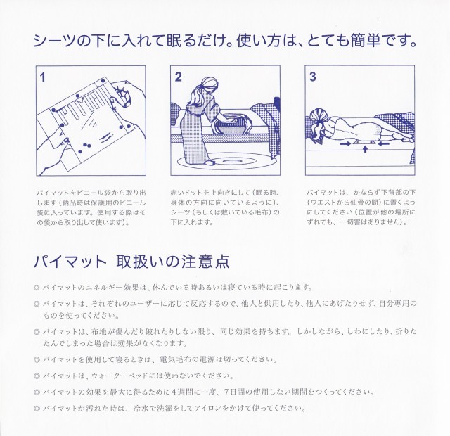 パイマットの使い方はとても簡単で、ふとんのシーツの下に入れてその上で眠るだけです。
