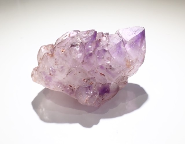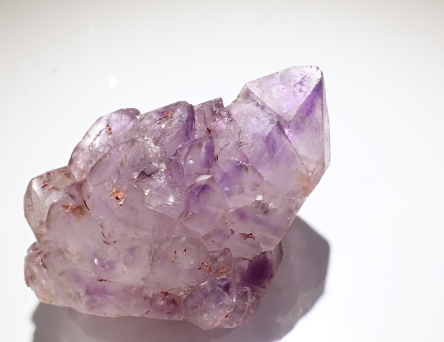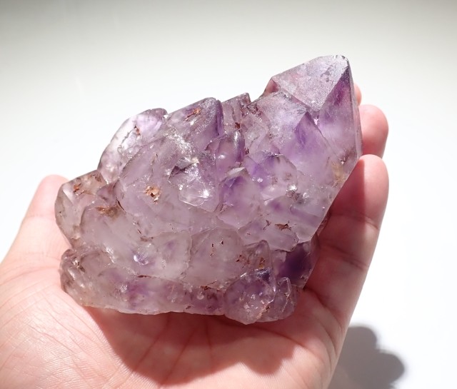 形状も良く、とても優しい雰囲気でアメジストの入ります。トップはファントム状にアメジストが入り、中部~下部にかけては小さい結晶が折り重なるようにカテドラル状になっています。形、色合い共に素晴らしいエレスチャルのクラスターかと思います。