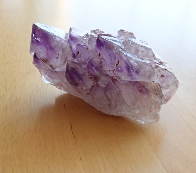 水晶の最後の姿を「エレスチャル」と呼んでいます。独特な結晶状態から「骸骨水晶(スケルタルクォーツ)」「鰐水晶(ジャカレークォーツ)」とも呼ばれていますが、その中でも水晶の中にアメジストが入っているものを「アメジスト・エレスチャル」と呼んでいます。途方も無い年月をかけて小さないくつもの結晶が成長の段階でくっつき合い、独特な模様が生まれます。