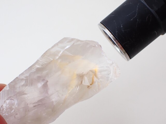 ファントムが紫外線ライトで黄色く蛍光する珍しいアメジストです。