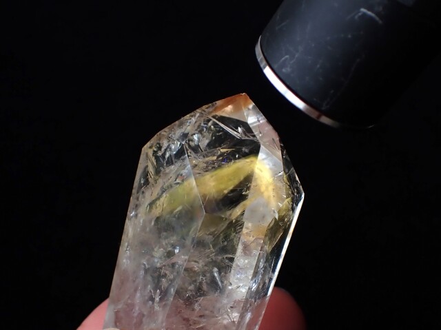 ファントムが紫外線ライトで黄色く蛍光する珍しいアメジストです。
