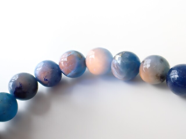 アフガナイトの特徴として、青の発色は硫黄含有によるもので、硫黄を含まないと無色になります。紫外線ライトやブラックライトで照射すると、ピンク~オレンジに蛍光する特徴があります。