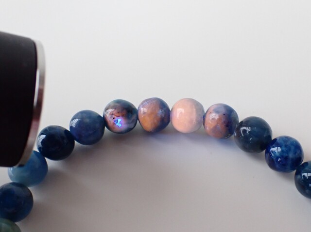 アフガナイトの特徴として、青の発色は硫黄含有によるもので、硫黄を含まないと無色になります。紫外線ライトやブラックライトで照射すると、ピンク~オレンジに蛍光する特徴があります。