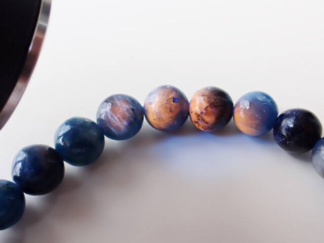 アフガナイトの特徴として、青の発色は硫黄含有によるもので、硫黄を含まないと無色になります。紫外線ライトやブラックライトで照射すると、ピンク~オレンジに蛍光する特徴があります。