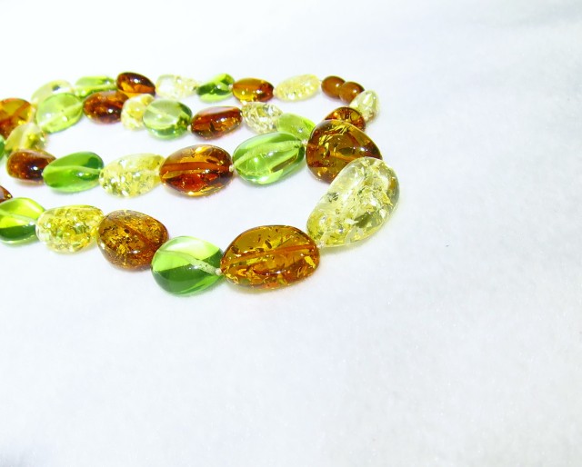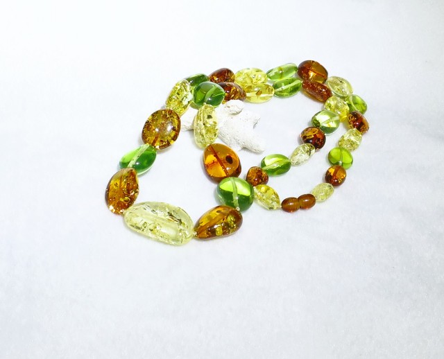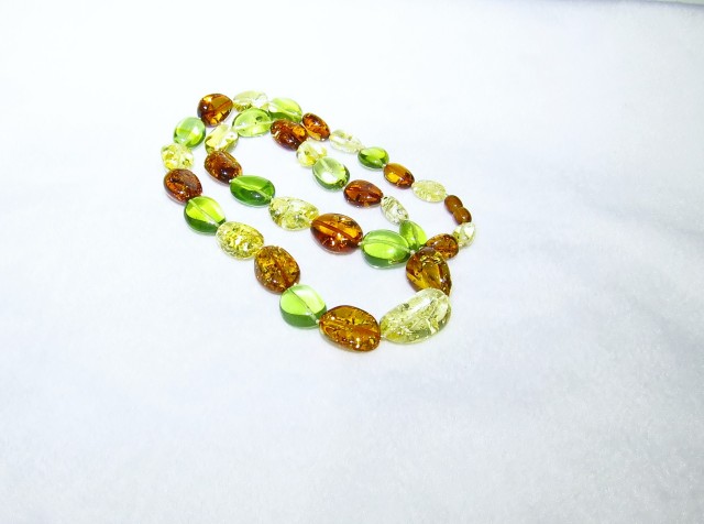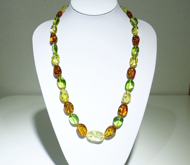 リトアニア産のアンバーが入荷致しました。グリーンやレッドなどのカラーアンバーは加熱処理にて色合いを出しております。ただ、そのカラーアンバーはジュエリーとしてあえて加熱処理を施してあります。新緑を思わせる綺麗なグリーンアンバーのミックスです。おすすめのひと品になります。
