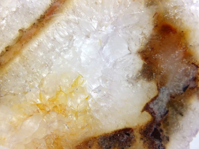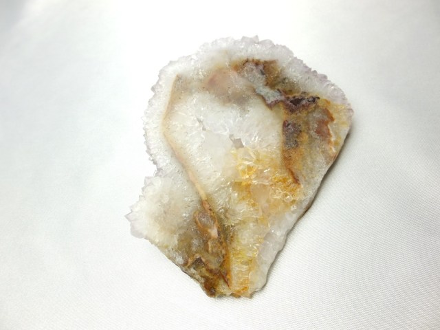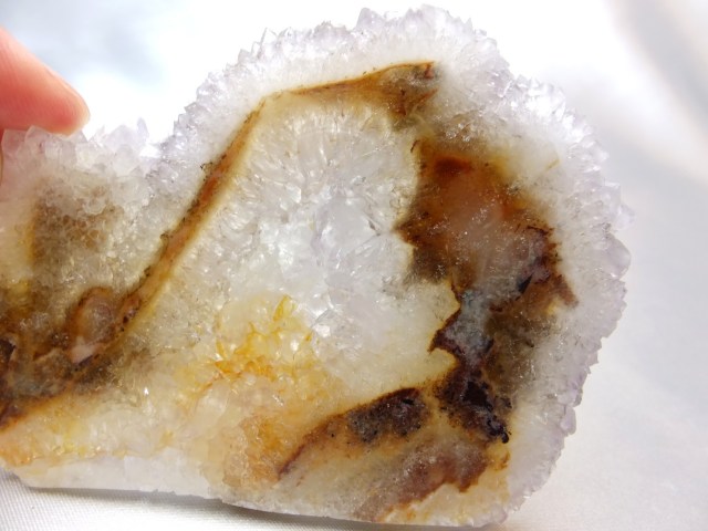 南アフリカのブッケンハート(Boekenhout)近郊で産出されたスピリットクォーツの母岩根元部分を磨いたものになります。周辺は淡いアメシストのスピリットクォーツ(カクタスクォーツ)の結晶がキラキラと輝き、それらに挟まれてやや不透明なジャスパー部分があります。スライスされた表面の独特な模様が特徴で、稀少なヒーリングストーンとしても人気があります。
