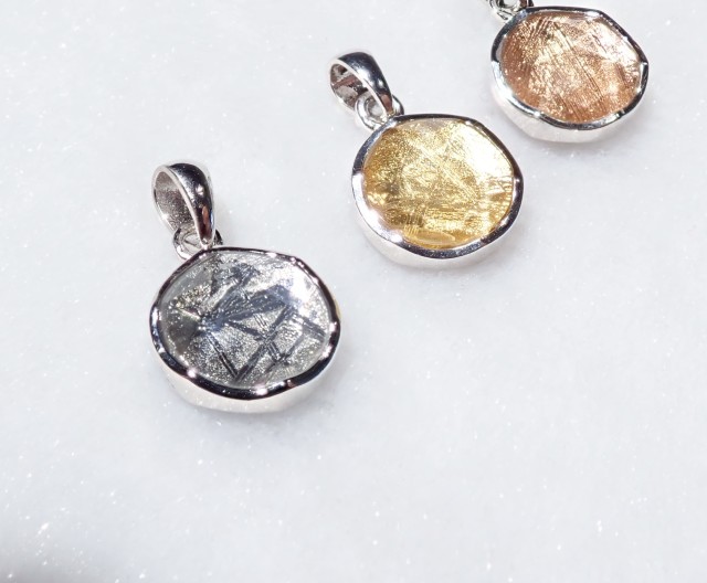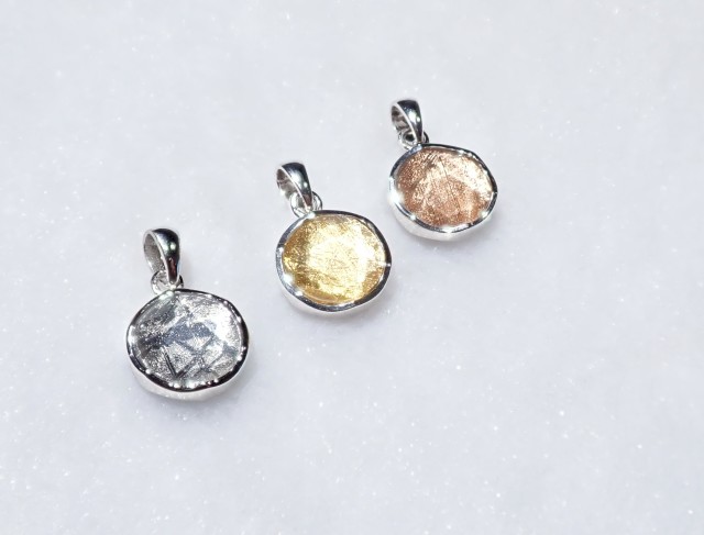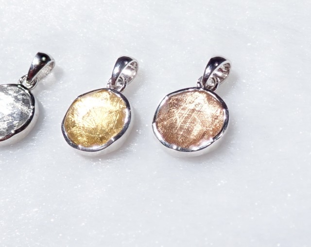 シルバー、ゴールド、ピンクゴールドの3色をご用意致しております。表裏の表面は人工水晶でコーディングしてありますので、錆びにくいギベオンとなっております。