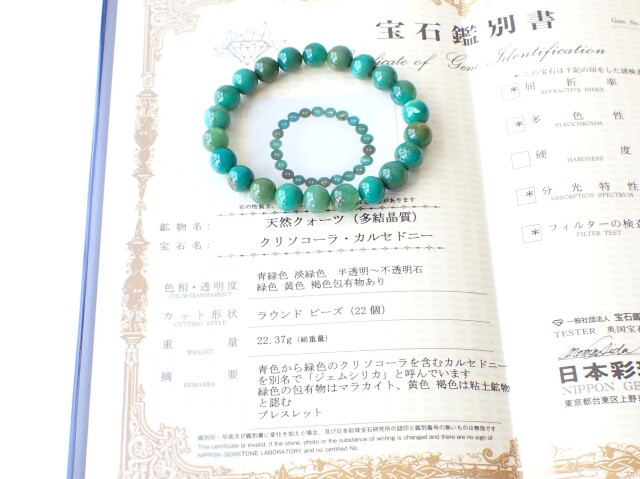 GD0121 ジェムシリカ(クリソコーラ・カルセドニー) 9mm~9.9mm ブレスレット ☆宝石鑑別書付き☆