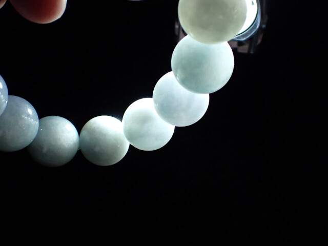 また、厚みのある15mmUPでありながら全珠が透過する透明感もあります。非常に稀な状態の青翡翠かと思います。