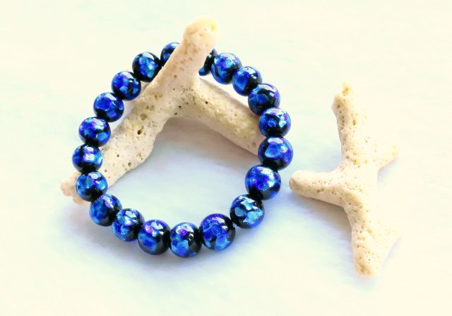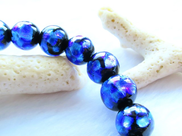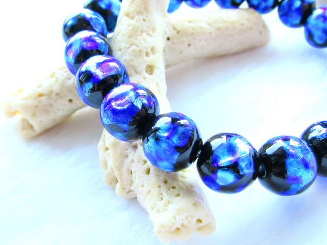 お取り扱いができるようになりましたホタルガラスのブレスレットです。ホタルガラスとは、琉球ガラスの職人さんがひとつひとつを丁寧に仕上げたビーズになります。銀箔を特殊な技法によりガラス内に入れ込んだ、綺麗な色合いが特徴になります。『ホタル玉』とも呼ばれています。グレードも存在しており、今回当店に入荷したホタルガラスは最高級品になります。深い色合いは、神秘的な様相を呈しております。アクセサリーとしても大変綺麗なもので、沖縄伝統の琉球ガラスが間近で見れる貴重なお品です。