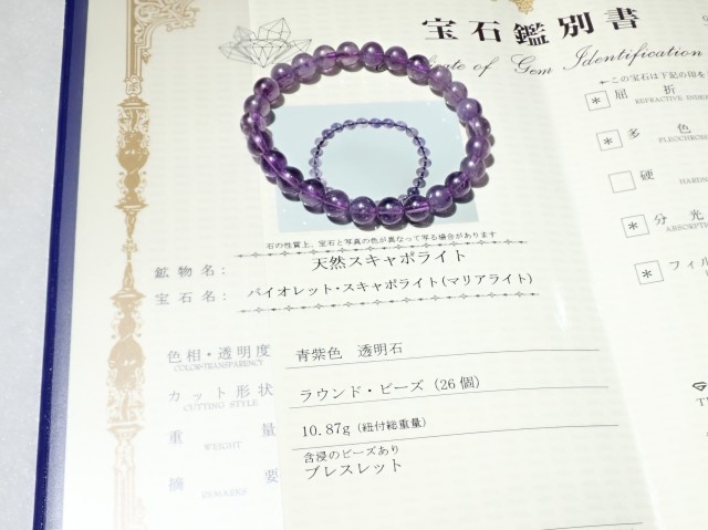 スキャポライトの中で一定の条件を満たしたものを『マリアライト』と呼びます。パープル(紫色)のスキャポライトでもマリアライトではないものもございます。スキャポライトの中でナトリウムを多く含むものがその条件となるようです。鑑別機関に出しても成分分析が必要となり、鑑別には時間も掛かります。マリアライトはスキャポライトの中でも貴重なものとなります。また、達成・成功の石としても知られており、何か新しいことにチャレンジする方や目標を達成したい方などにもおすすめなストーンです。