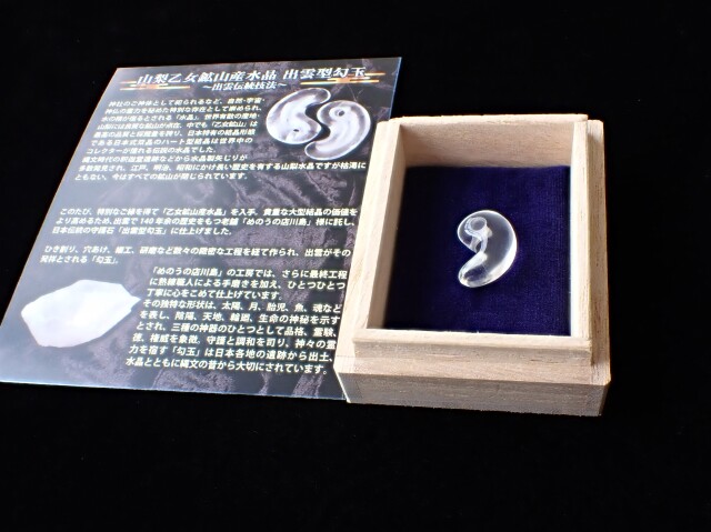 この度、特別なご縁を得て、『乙女鉱山産水晶』を入手。貴重な大型結晶の価値をより高めるため、出雲で140年余りの歴史を持つ老舗『めのうの店川島』様に託し、日本伝統の守護石『出雲型勾玉』に仕上げました。