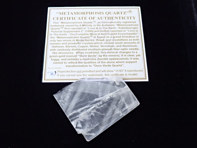 『メタモルフォーゼスクォーツ』は、同産地なのですがA.メロディ女史を経由せずに流通したものになりますので証明書等は付属致しません。