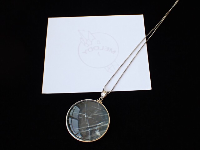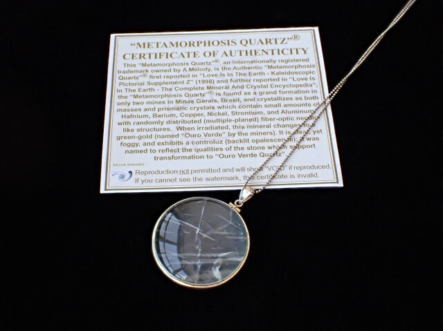 こちらは、A.メロディ女史の正規証明書付が付属する貴重なペンダントトップです。ライトを当てるとスターが出ます。当店でも2点ほどある大きめなスターメタモルフォーシスクォーツのPTの内の1点でこちらは初期の形状(枠)のものになります。当店には2012年に入荷したものですが、そこから3年くらい前に作られたものと思われます。
