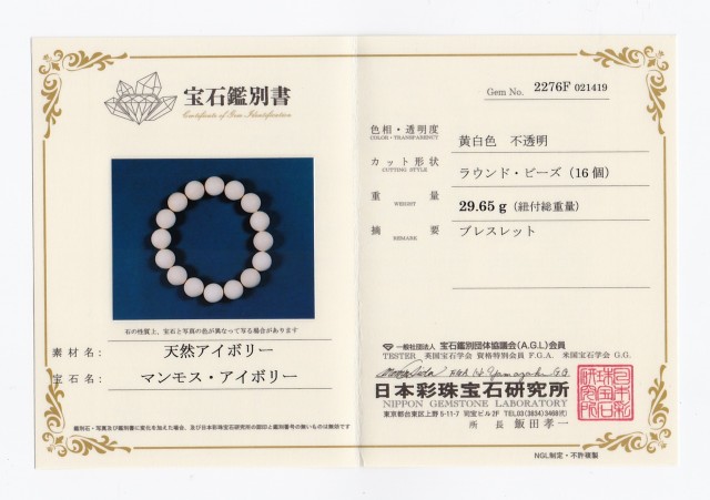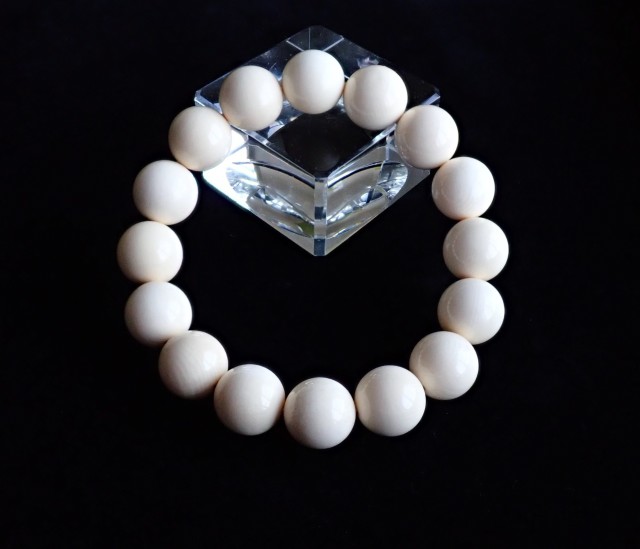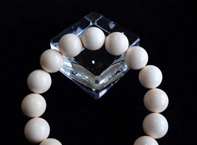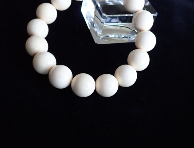 多くの牙は中国へ取引され『アイス・アイボリー』という名称で『象牙』に変わり、年々需要が高まっています。画像ではわかりにくいですが、ビーズ表面にはマンモス・アイボリーの特徴である年輪のような模様がある珠もございます。まだ見たことはないのですが、需要が高まるにつれ価格も上がっていくと、偽物(練り物)なども出てくる可能性もあります。マンモス・アイボリーについては宝石鑑別書は必須であると考えております。