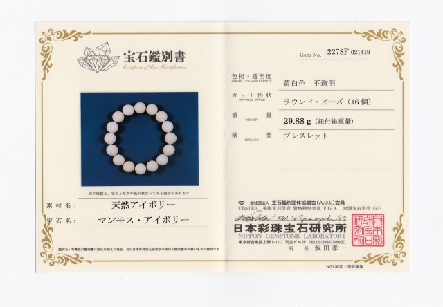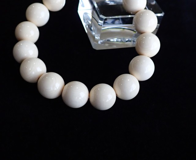 多くの牙は中国へ取引され『アイス・アイボリー』という名称で『象牙』に変わり、年々需要が高まっています。画像ではわかりにくいですが、ビーズ表面にはマンモス・アイボリーの特徴である年輪のような模様がある珠もございます。まだ見たことはないのですが、需要が高まるにつれ価格も上がっていくと、偽物(練り物)なども出てくる可能性もあります。マンモス・アイボリーについては宝石鑑別書は必須であると考えております。