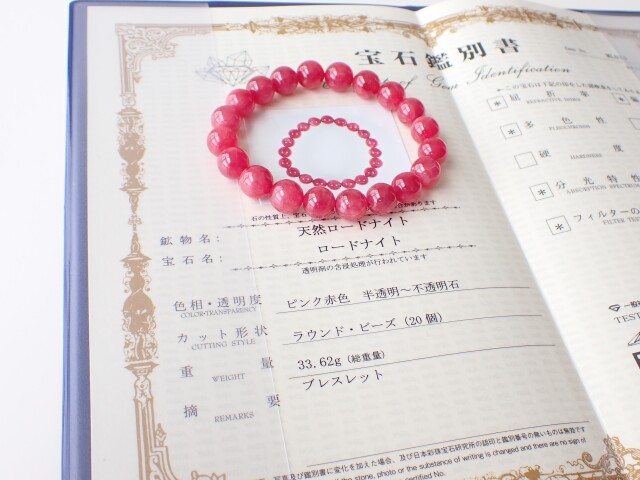 こちらは最高品質のインペリアルロードナイトよりワンランク下のものになります。ただ、その最高品質と並べて比べないとわからない程度の差で、インペリアルロードナイトと呼んでもいい品質かと思います。お値段は最高品質のものよりかなりお安くはなりますが、品質はさほど変わらないものとなります。また、インペリアルロードナイトと呼ばれる濃い赤のロードナイトは染色が心配されるため、今回も鑑別書を取得してあります。人工的な染色は認められませんでした。