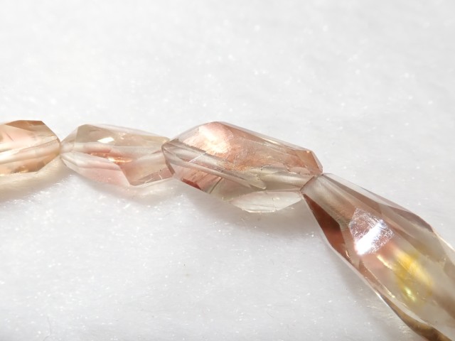 オレゴンサンストーンはアメリカ オレゴン州で産出される稀少鉱物で、ラブラドライトに自然銅が含まれ、その銅の結晶片により赤っぽく見えたり緑色を示します。ほとんどがルースやジュエリーとして流通しており、ブレスレットとなっているものは稀です。