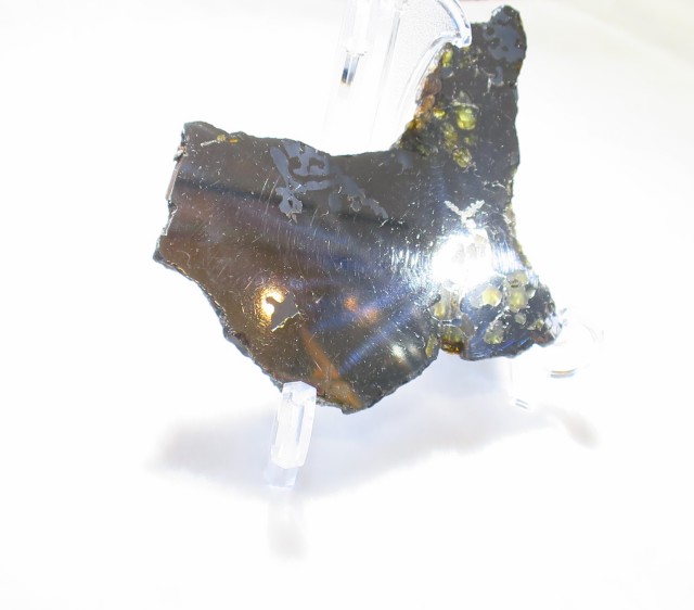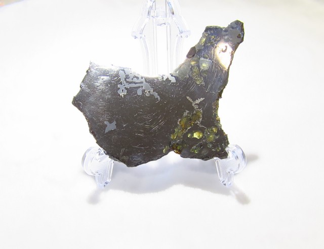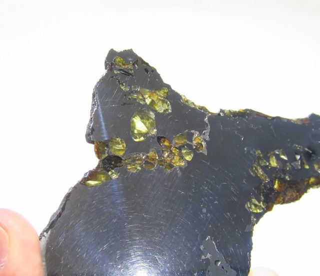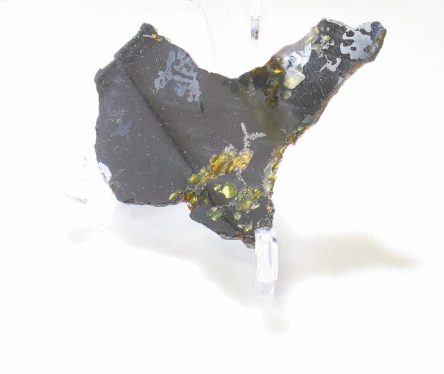主にパラサイト隕石と呼ばれるものは、鉄・ニッケル合金とかんらん石(ペリドット)のみで構成された隕石になります。 黄色~緑色の部分がペリドットになります。 『宇宙ペリドット』等とも呼ばれています。