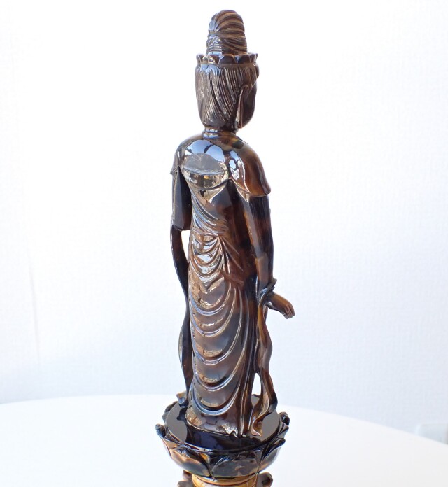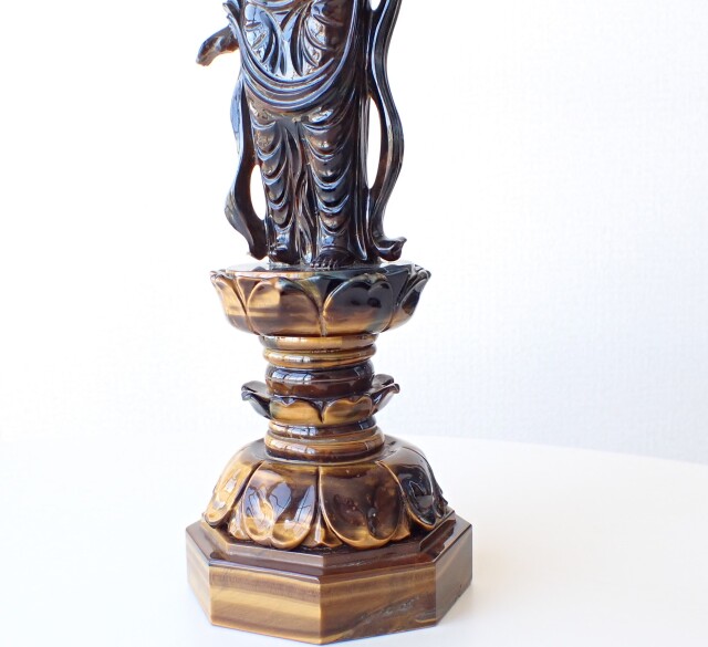 台座と仏像は別々にカービングされ完成後に一体化したものです。仏像正面はタイガーアイでも暗めの部分をもってきているため、観音様の輪郭や精巧に彫刻された部分が映えます。台座まで同じ石種で作られた仏像は大変珍しく貴重な工芸品になります。全体的に素晴らしい逸品かと思います。