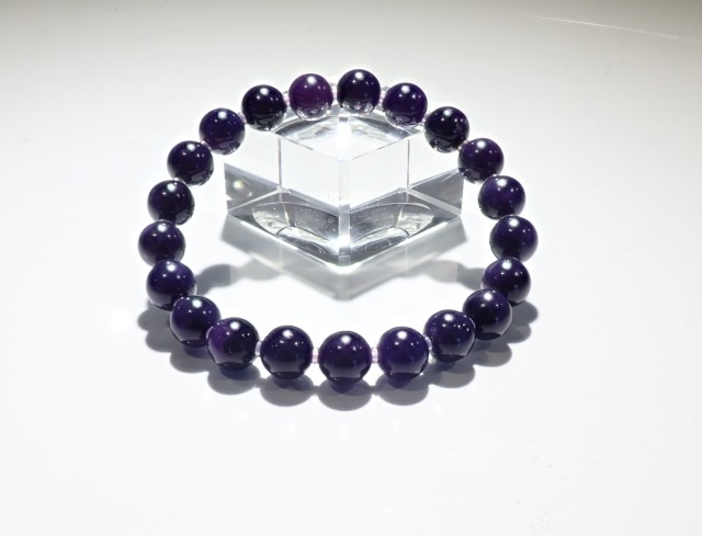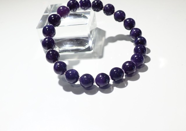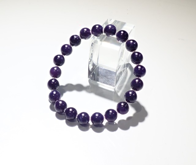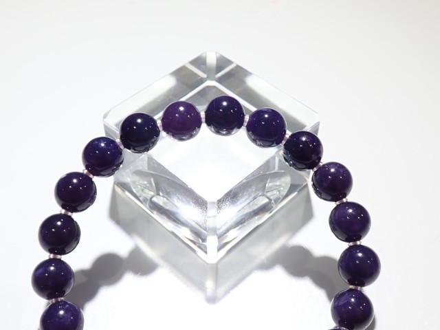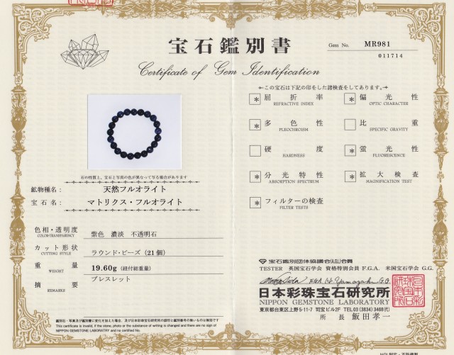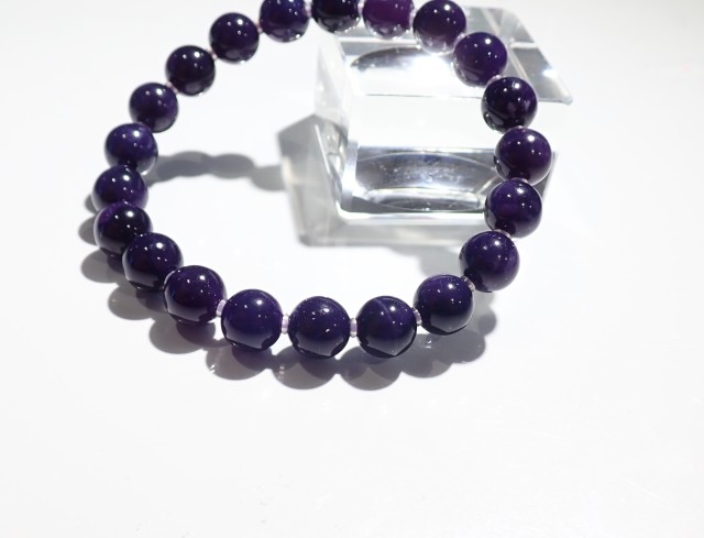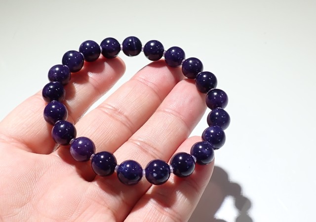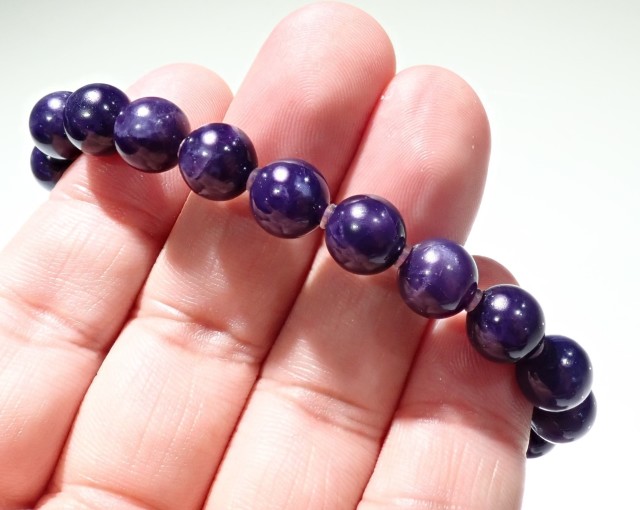 こちらのティアファニーストーンについては、鑑別書に関しても本来であれば、白い部分(オパール化した部分)があるティファニーストーン『バイオレットコモンオパール』で鑑別がでますが、こちらは、ほぼバイオレット部分なので『マトリックスフローライト』ででております。手にした感じは、フローライトのずっしり感はありません。おそらく、規定量のオパールが検出されなかったためマトリックスフローライトで鑑別されたのではと考えます。原石の中でもこのような濃い部分は少なく、その貴重な部分をビーズに加工したものになります。