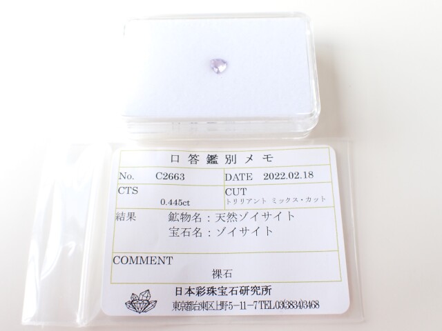 産地:タンザニア メレラニ鉱山 ピンクタンザナイト(ゾイサイト) ルース ソーティング(口答鑑別メモ)付き