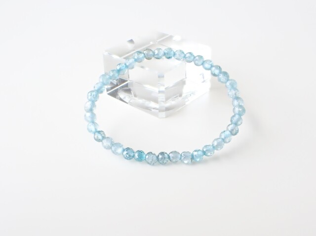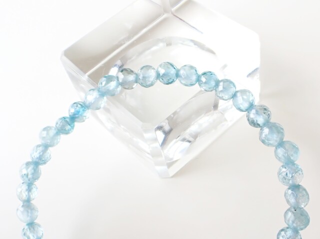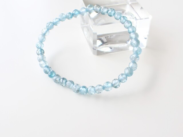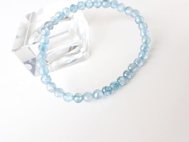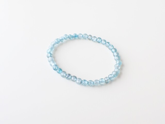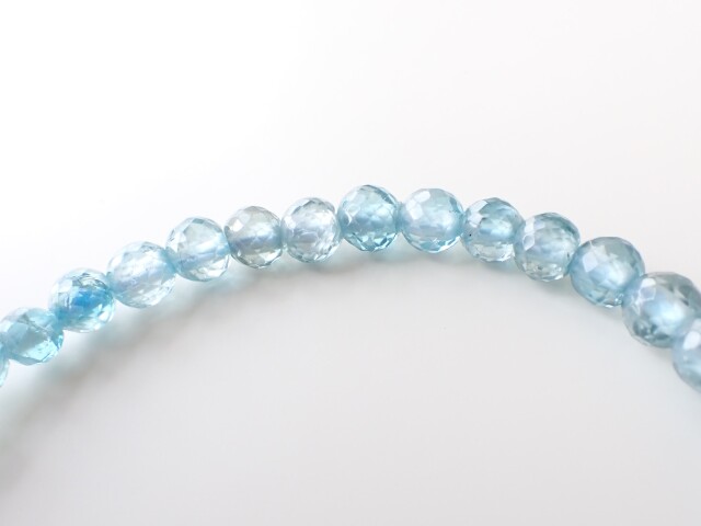 天然ジルコンのビーズブレスレットは当店でも初めてでして、インクルージョンも多少見られますがこの爽やかなミントブルーのカット面がキラキラと輝きます。