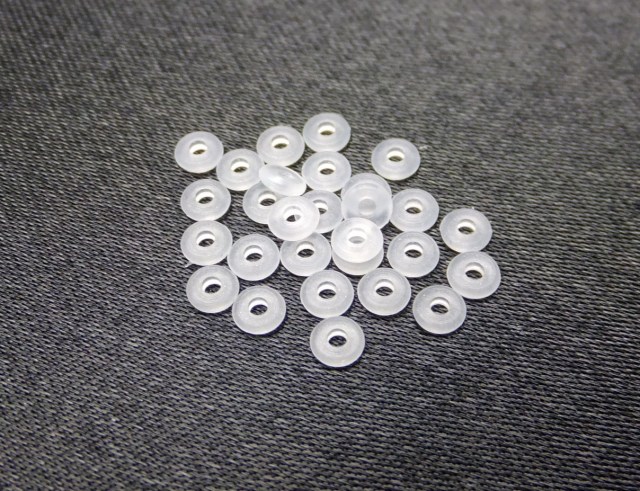 ブレスレット作成時などに便利な保護用シリコン(50個入り)です。こちらのシリコンを珠間に入れることにより、石への摩擦や衝撃を抑えます。また、珠数が足りなく、腕回りの調整等にもお使いいただけます。1個あたり、約0.8mmの厚さです。こちらはリクエストが多い商品でした。